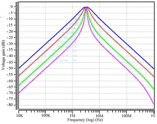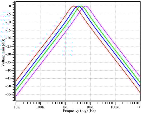The VM bandpass filter at the output Vo2 of Figure 2 when variation in fo with Q fixed at 1 (fo = 2.13 MHz: red; fo = 3.22 MHz: blue; fo = 4.32 MHz: green; and fo = 6.48 MHz: pink).