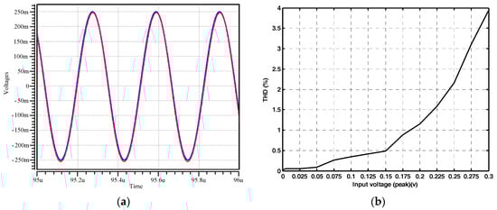 Time-domain results of VM bandpass filter at the output Vo2 of Figure 2 (a) input (blue line) and output (red line) waveforms; (b) total harmonic distortion (THD) analysis results on input voltage at 3.183 MHz.