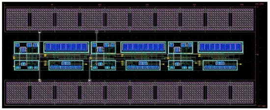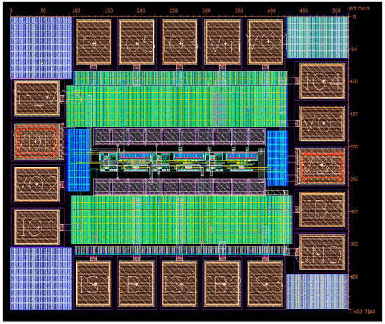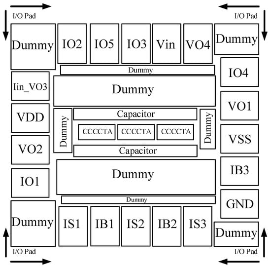The layout of the entire schematic was done using cadence’s virtuoso tool. Figure 13 and Figure 14 show the overall chip layout and the detail layout of the filter core, respectively. The layout floorplan is shown in Figure 15 which explains element placement. The component values of Figure 13 and Figure 14 were given by gm = 100 μS, RX = 10 kΩ and C1 = C2 = 5 pF, leading to a center frequency fo = 3.183 MHz. A design rules check (DRC) and a layout versus schematic (LVS) comparison were performed on the layout. The DRC checks for potential errors in the layout. The LVS checks the layout against the schematic and verifies that all the nets are matching. After the DRC and LVS were completed successfully, layout extraction was done. The extraction gives an overall idea about the parasitics of the design. All these processes are carried out using a cadence virtuoso schematic and layout editor tool for TSMC 0.18-μm CMOS process technology. The post-layout simulations were carried out to check the functionality of the design. Figure 16 represents the post-layout simulated frequency responses for the HP (Io1), BP (Io2), LP (Io3) and BP (Io4) filters in the CM. The post-layout simulation results show the CM simulated natural frequency as 3.10 MHz, that is, an approximately 2.52% error with the theoretical value. Figure 17 represents the post-layout simulated frequency responses for the LP (Vo1), BP (Vo2), HP (Vo3) and BS (Vo4) filter in the VM. The post-layout simulation results show the VM simulated natural frequency as 3.08 MHz, that is, an approximately 3.14% error with the theoretical value. Figure 18 represents the post-layout simulated frequency responses for the HP (Io1), BP (Io2), LP (Io3) and BS (Io4) filter in the TAM. The post-layout simulation results show the TAM simulated natural frequency as 3.10 MHz, that is, an approximately 2.52% error with the theoretical value. Figure 19 represents the post-layout simulated frequency responses for the LP (Vo1), BP (Vo2), HP (Vo3) and BP (Vo4) filter in the TIM. The post-layout simulation results show the TIM simulated natural frequency as 3.09 MHz, that is, an approximately 2.83% error with the theoretical value. It appears from Figure 16, Figure 17, Figure 18 and Figure 19 that the filter post-layout simulation performs all the filter functions well, but the small departures filter responses mainly stems from the parasitic impedance effects and non-ideal gains of the CCCCTA. The total power dissipation is found to be 0.593 mW. The chip area without pads is only 0.5177 × 0.4507 mm2.