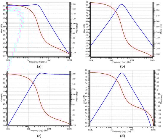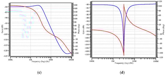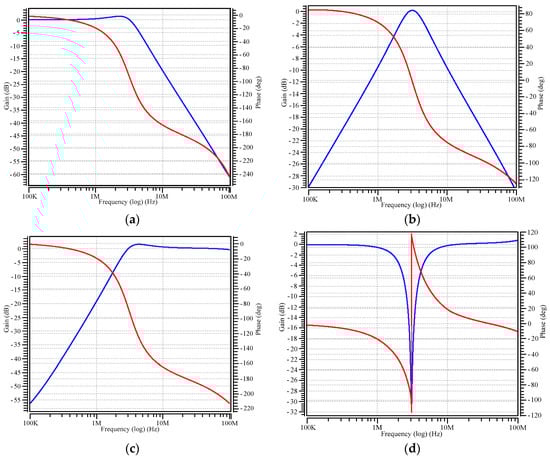 The VM post-layout gain (blue line) and phase (red line) simulation responses (a) lowpass filter (Vo1/Vin); (b) bandpass filter (Vo2/Vin); (c) highpass filter (Vo3/Vin); and (d) bandstop filter (Vo4/Vin).