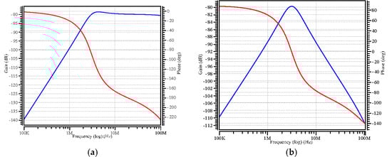 The TIM post-layout gain (blue line) and phase (red line) simulation responses (a) lowpass filter (Vo1/Iin); (b) bandpass filter (Vo2/Iin); (c) highpass filter (Vo3/Iin); and (d) bandpass filter (Vo4/Iin).