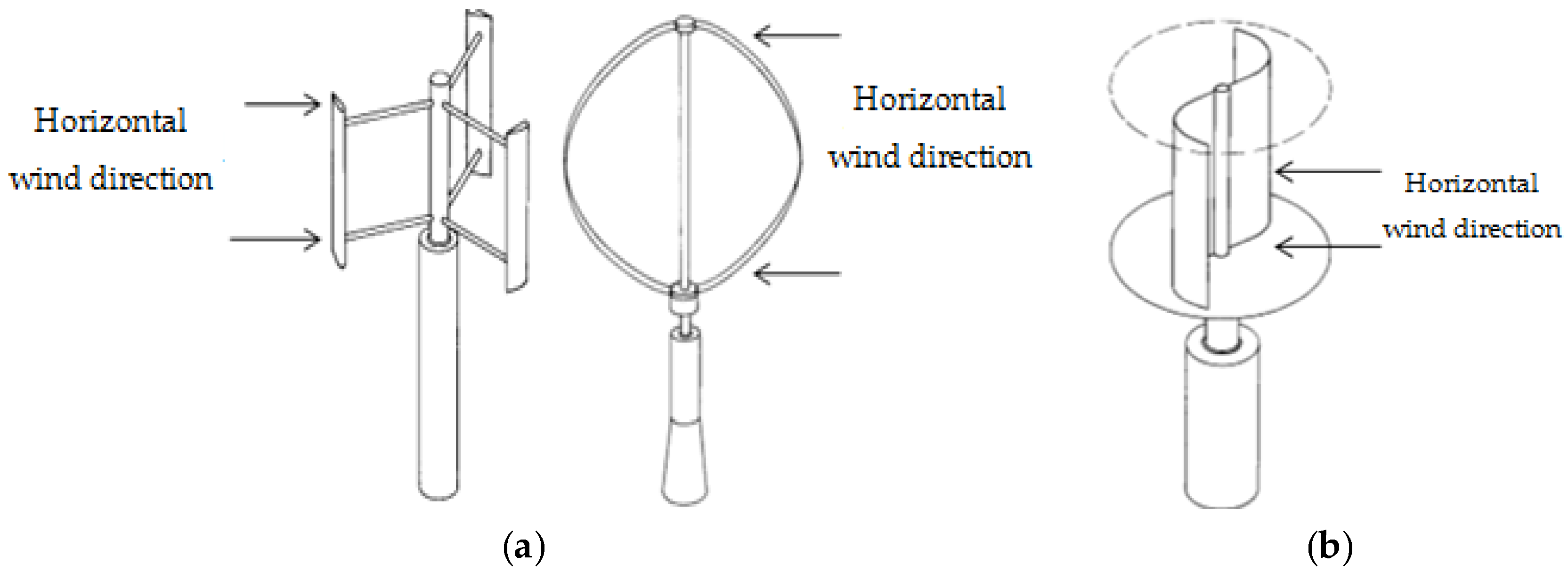 Figure 2. Two distinct types of VAWT operating under any horizontal wind direction [24]. (a) Darrieus rotors; (b) Savonius rotor.