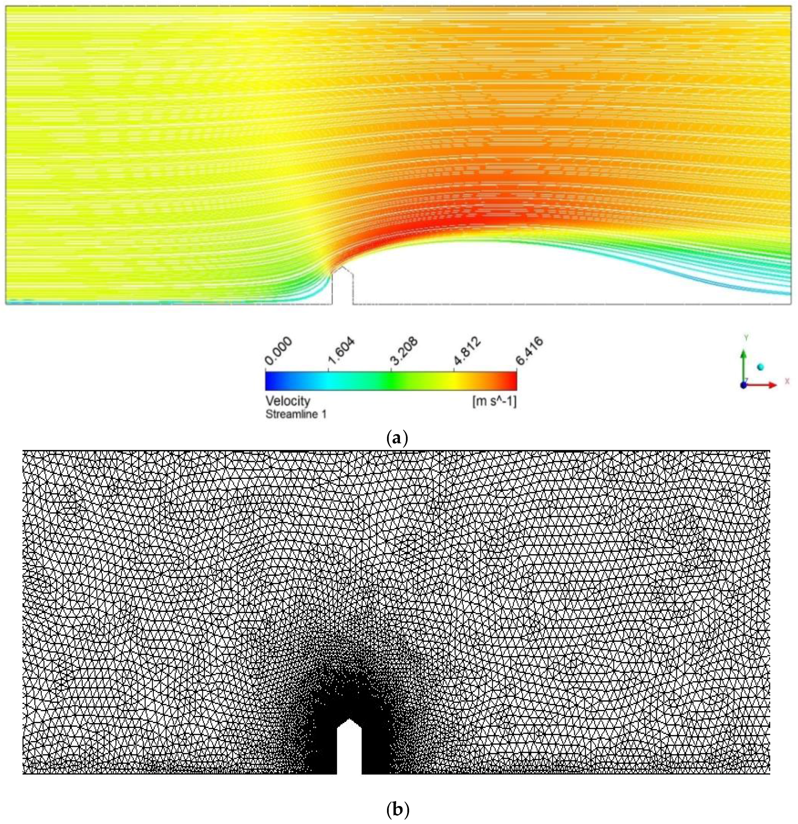 Figure 8. (a) Velocity streamline for gable rooftop; and (b) 2 D mesh for the building model.