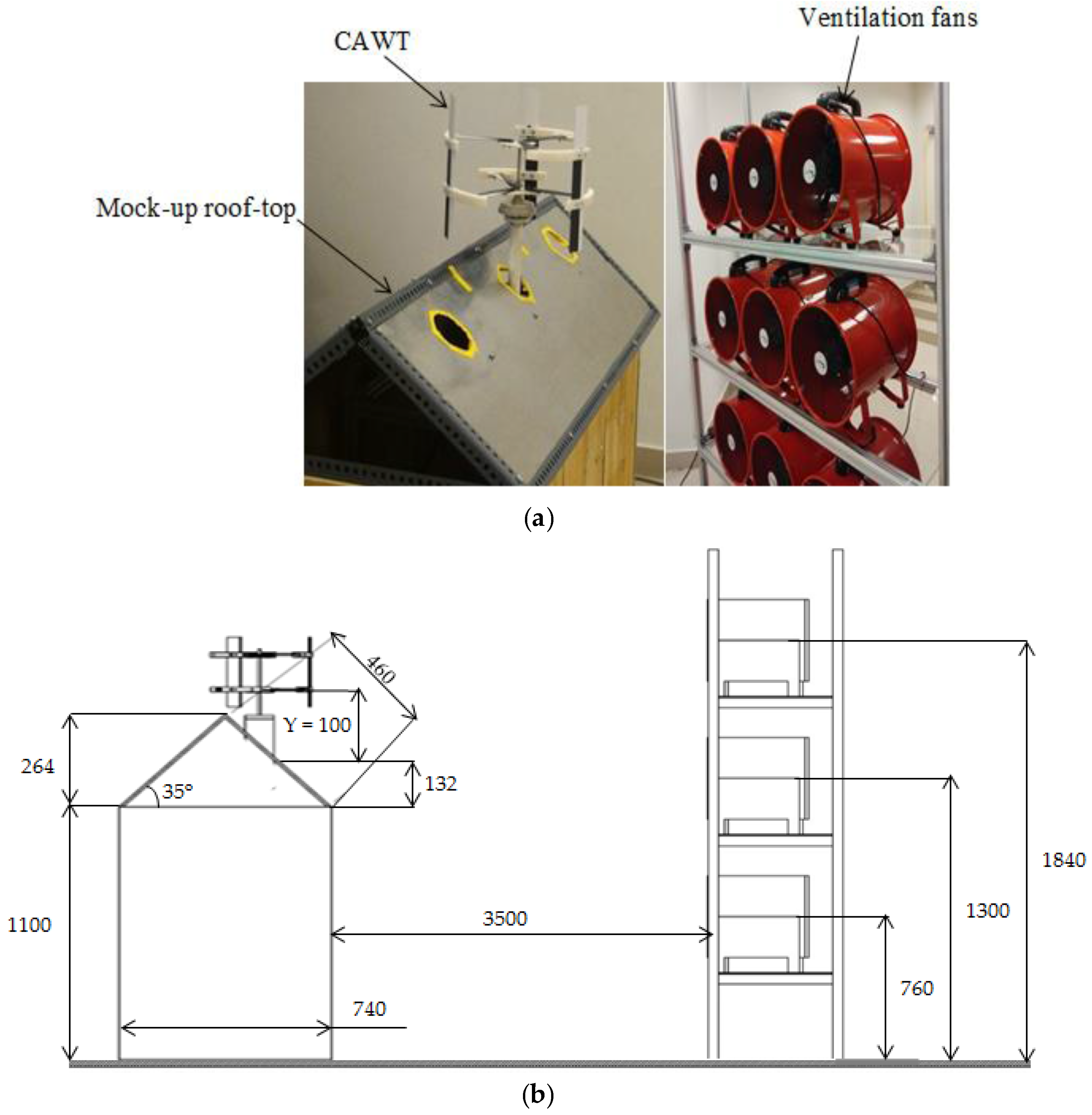 Figure 9. (a) Experimental set-up of the CAWT; and (b) detailed dimensions of a building integrated with a CAWT and dimensions of the ventilation fans (all dimensions in mm).