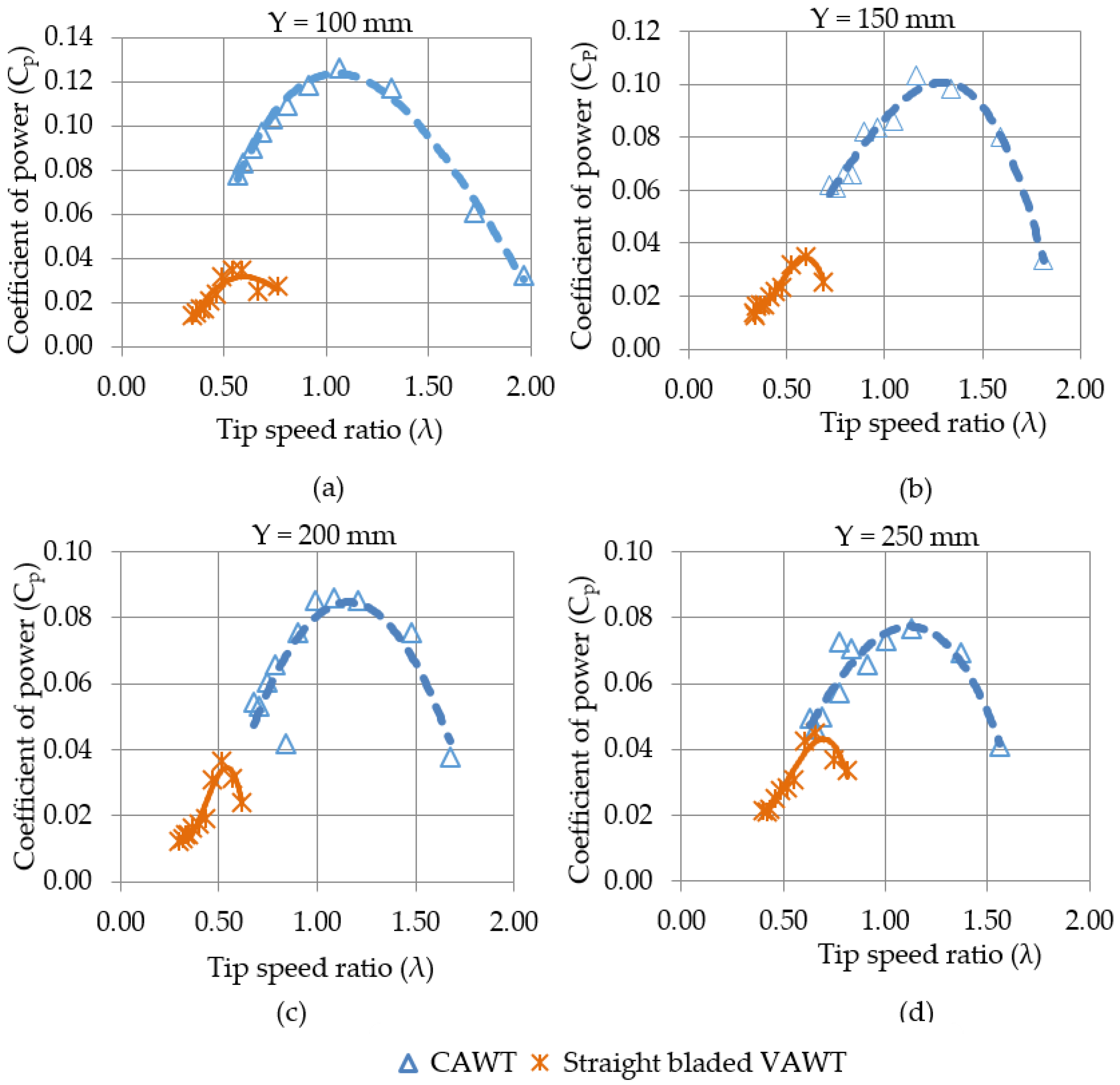 Figure 12. Coefficient of power against tip speed ratio for CAWT and straight-bladed VAWT for height above the rooftop: (a) Y = 100 mm; (b) Y = 150 mm; (c) Y = 200 mm; and (d) Y = 250 mm.