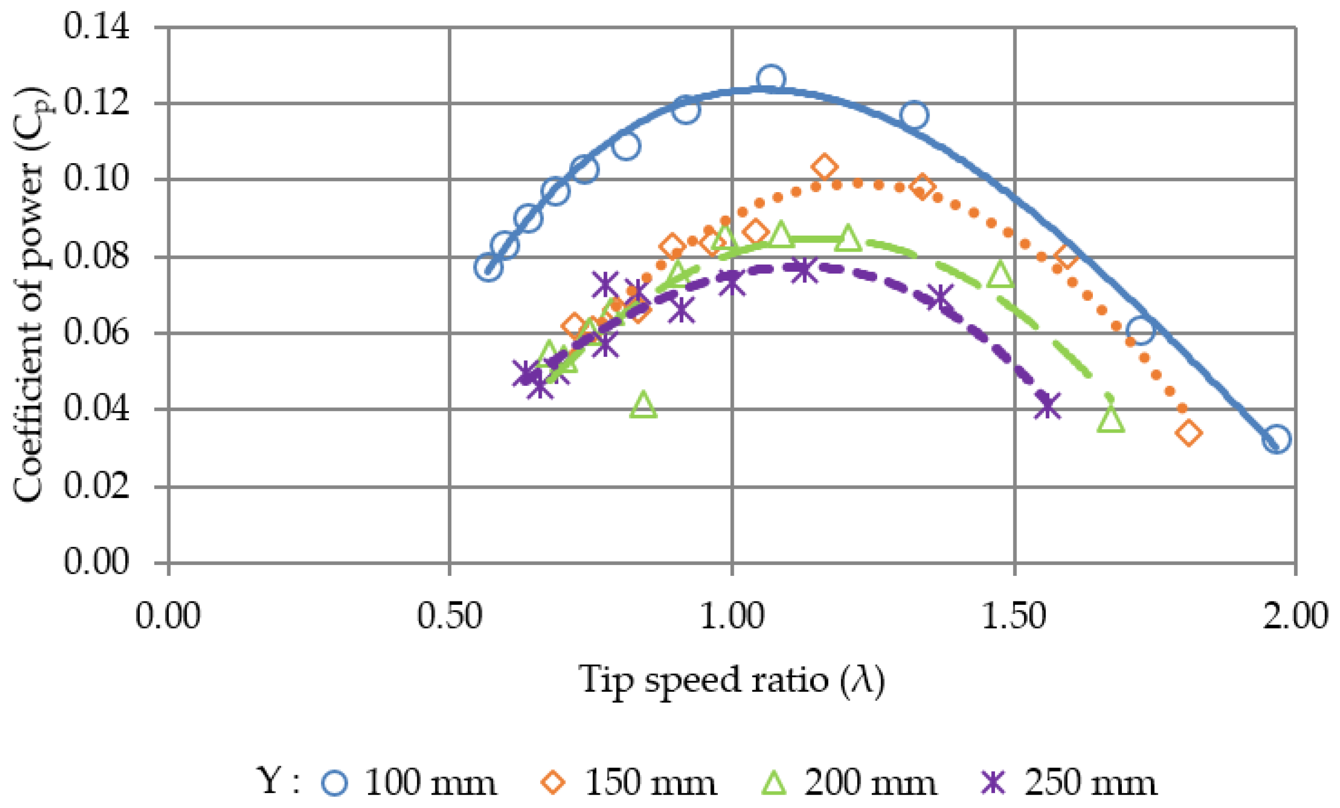 An experiment was conducted with the CAWT and the straight-bladed VAWT integrated onto a low-rise building model with a gable rooftop. Two sets of experiments under the same conditions, i.e., one for the CAWT and another one for the VAWT, were conducted. The heights of the two turbines (CAWT and VAWT) above the rooftop were varied for four different heights (Figure 9b), i.e., from Y = 100 to 250 mm with increment of 50 mm for each case. The performance of the two turbines was evaluated based on the maximum Cp, TSR, (λ), and RPM.