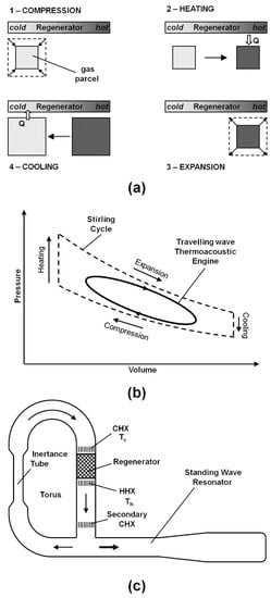 (a) Schematic of a gas parcel oscillating in the vicinity of a solid plate with an imposed temperature gradient, undergoing stages of compression and expansion; (b) pressure-volume (P-V) diagram illustrating the nature of the thermodynamic cycle; and (c) schematic of a possible configuration of a thermoacoustic travelling-wave engine.