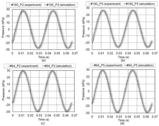 Once the model had been pre-validated, the permeability coefficient, K, of the regenerator was then predicted by carefully increasing the permeability value in ANSYS FLUENT [26] until the pressure drop matched the experimental value. As soon as the pressure drop matched, the validation was finalised by comparing the inlet velocity, calculated from the measured displacement of linear motor’s piston (V1 in Figure 5), and pressures at locations P2 and P5 (definition of locations is given in Figure 2). The same procedure was repeated for each case until a good agreement with the experiment was obtained for all samples tested. Figure 6 shows the results for pressure at locations P2 and P5 after the permeability tensor set matched the pressure drop measured in the experiment.