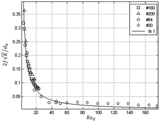 In the porous medium theory, the friction factor of most porous media is presented by the permeability Reynolds number, . The pressure drop characteristics of the porous medium are related to the permeability Reynolds number as given by [4]: