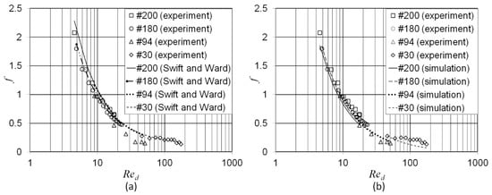 Comparison between friction factor from experiment: (a) Swift and Ward correlation of [7]; and (b) current CFD-assisted correlation.