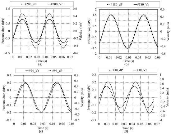 Pressure drop (dP) and velocity at regenerator (Vr) for: (a) #200; (b) #180; (c) #94; and (d) #30.