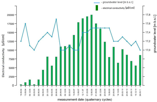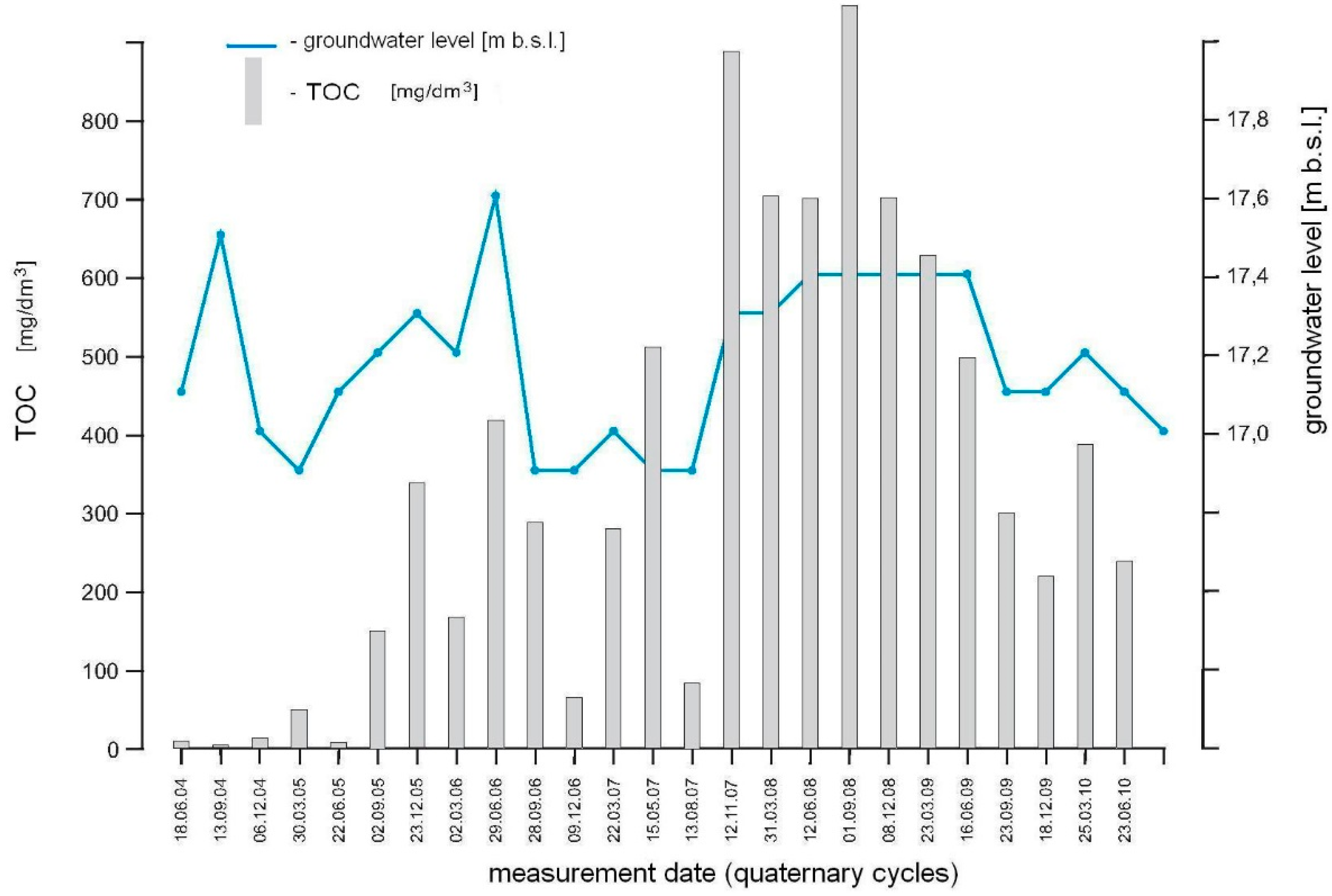 The investigation was performed due to the EC and TOC (total organic carbon) present in groundwater samples, collected from a selected piezometer. The piezometer was located where groundwater was discharged from the landfill (south western part). The changes of EC and TOC with ground water table fluctuations over time, are presented in Figure 2 and Figure 3. From the monitoring results, it was determined that the leakage had appeared in 2005 and had been most intensive in the following three years. The later drop in EC and TOC values was achieved by applying remediation solutions at the site (purifying pumping). The results of selected indicators of a groundwater quality assessment, are presented in Table 1. According to Polish standards, the salinity parameters indicate a IV and V quality class [34].