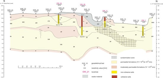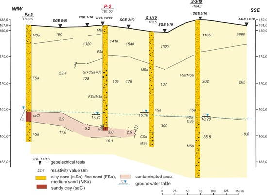 The measured resistivity distribution indicated a long-term emission of contaminants from the landfill, within the first aquifer layer (the groundwater table at 6 m b.s.l). The results of the geoelectrical tests are presented in Figure 9 and Figure 10, as subsoil cross-sections.