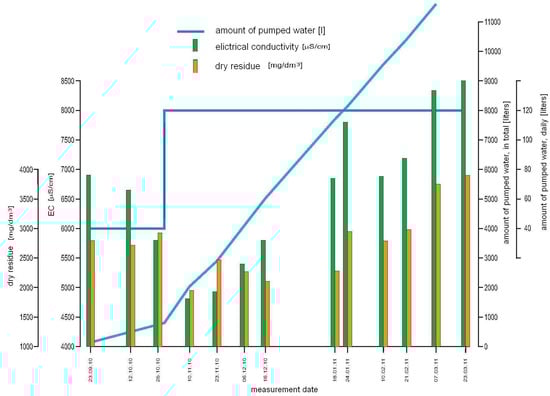 Pumping out 12,930 dm3 of water did not result in a significant increase in the water quality in piezometer P-2. At the beginning, pumping was carried out at a capacity of 40 L per day (blue line at Figure 5). The values of EC within this time decreased from 6961 to 4752 μS/cm, and the mass of dry residue (dried sewage sludge) decreased from 2804 to 1944 mg/dm3. Following this, the pumping capacity was tripled to 120 L per day. As a result, the EC increased to 8589 μS/cm, and the mass of the dry residue increased to 3916 mg/dm3. The increase of EC after the intensification of pumping could be a result of: