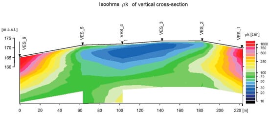 An occurrence of the glacial clay and sandy clay loam deposits of a thickness of approximately 4 m, lined with sands and gravel with an unknown floor depth was determined, based on the data from the boreholes. A free water table was observed at 16.3 and 17.5 m below the ground level. The electrical resistivity tomography (Figure 6) was performed by using electrodes spaced 4.8 m apart and a total measured length of 72 m.