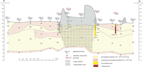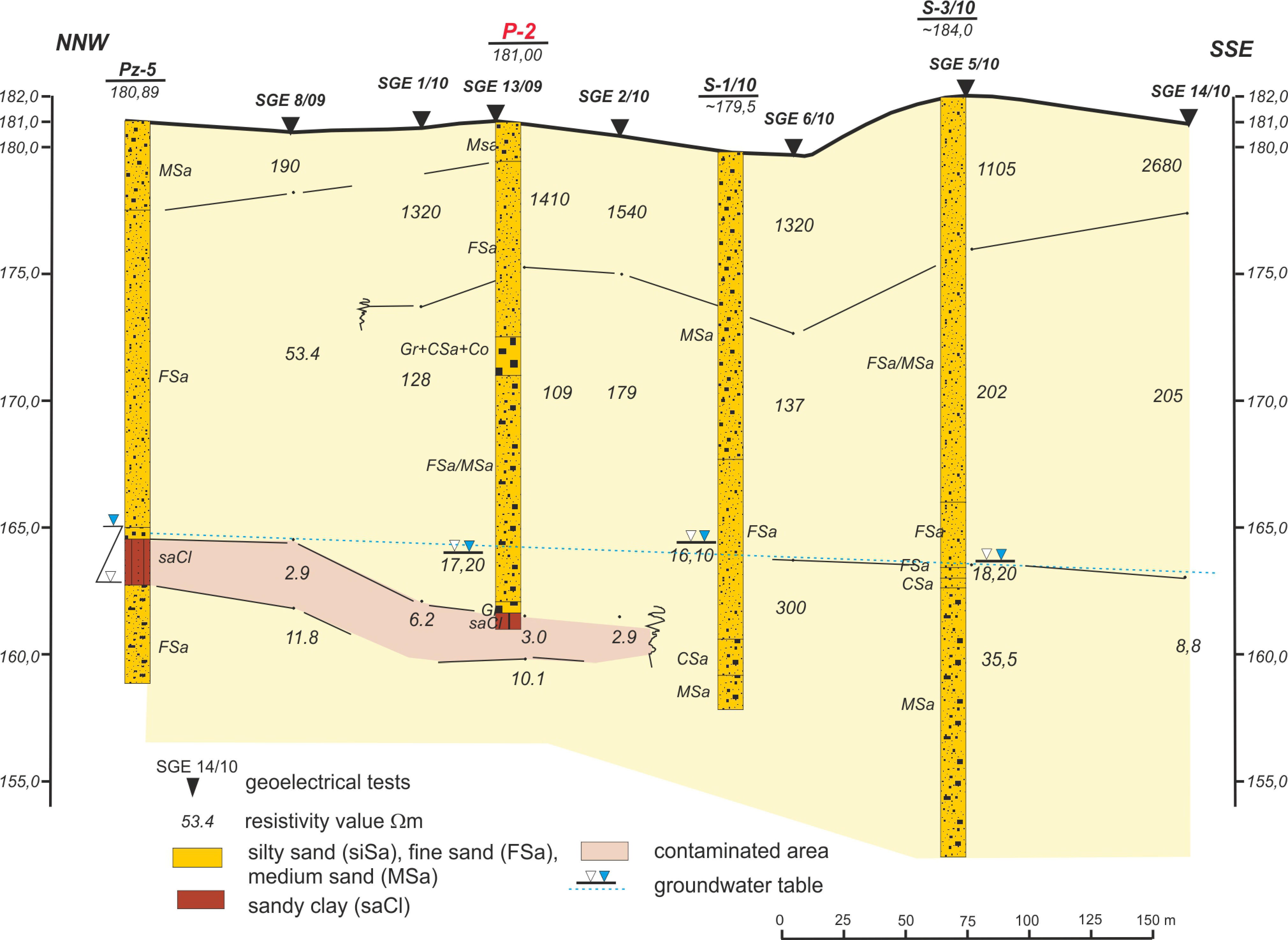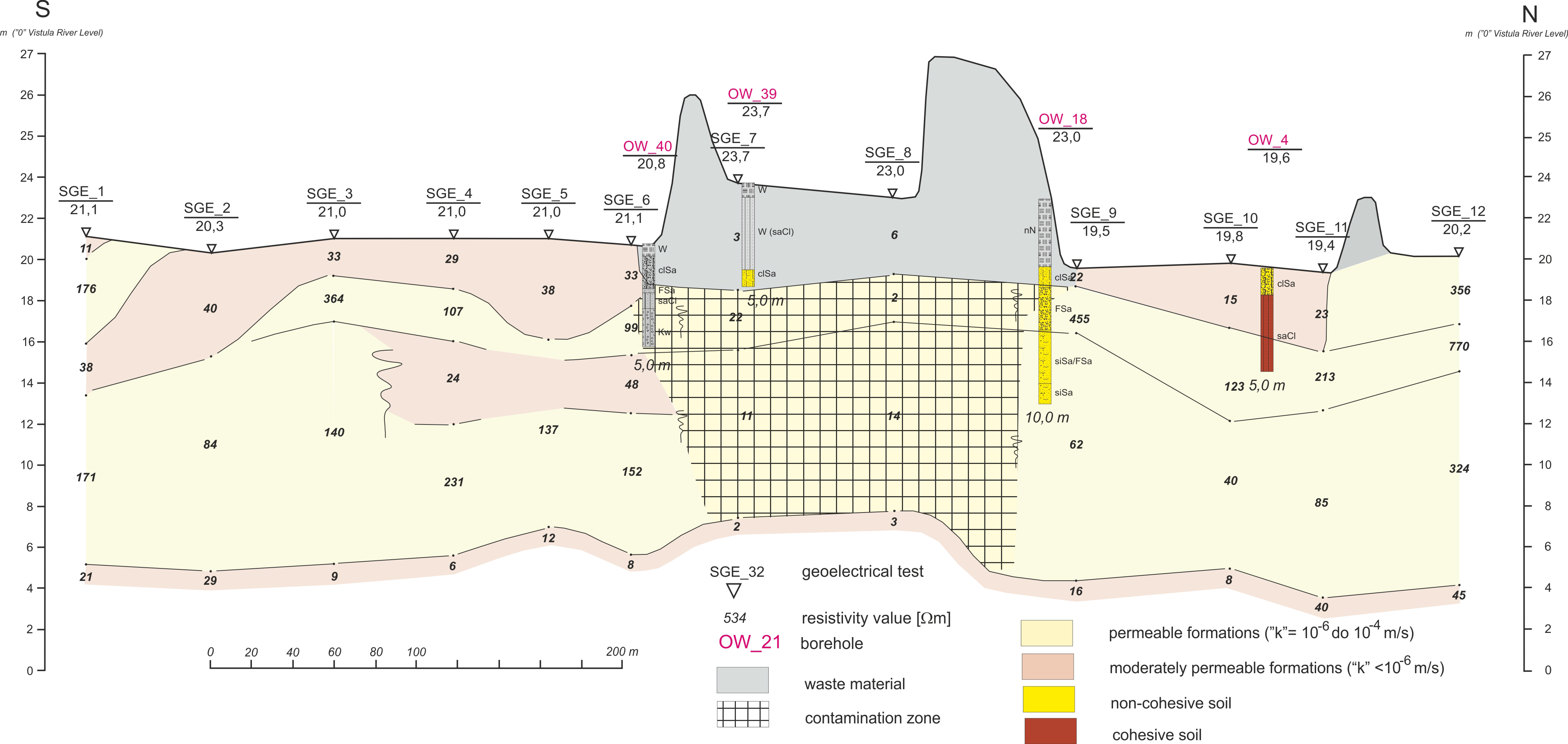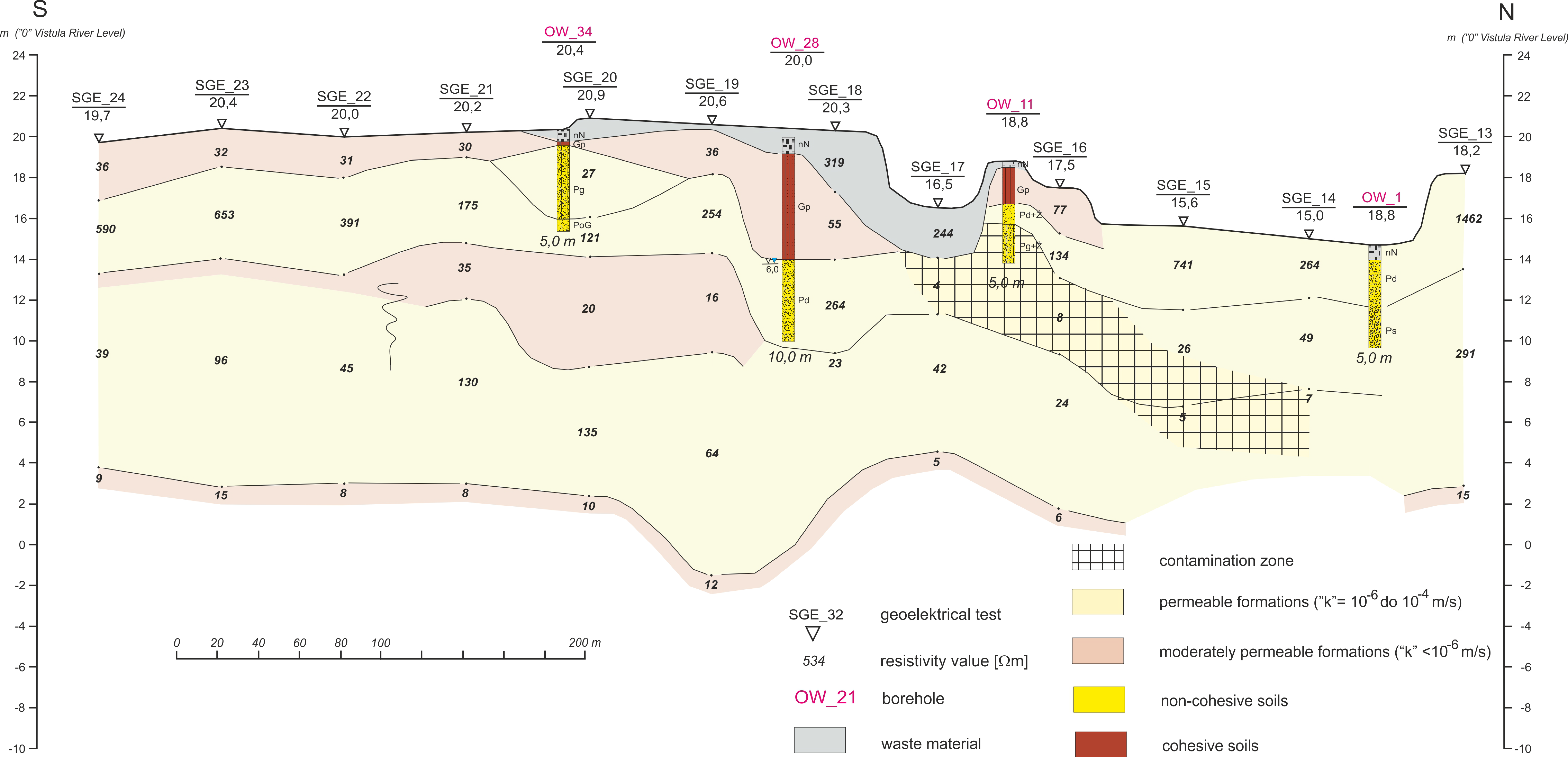 For the site investigation purposes, geophysical investigation was performed to identify the leakage zones. The electrical resistivity method was used to distinguish the top of the less permeable layers of clay in the landfill’s subsoil. The purpose of the tests was also to investigate the depth of the groundwater table and to confirm the direction of the groundwater flow in the south eastern part, where the leakage had occurred. The distance between testing points allowed an investigation of the subsoil as deep as 35 m below the ground level. The quantity interpretation gave a full picture of the resistivity characteristics, which are listed in Table 2. The interpretation and testing results are presented in Figure 4.
