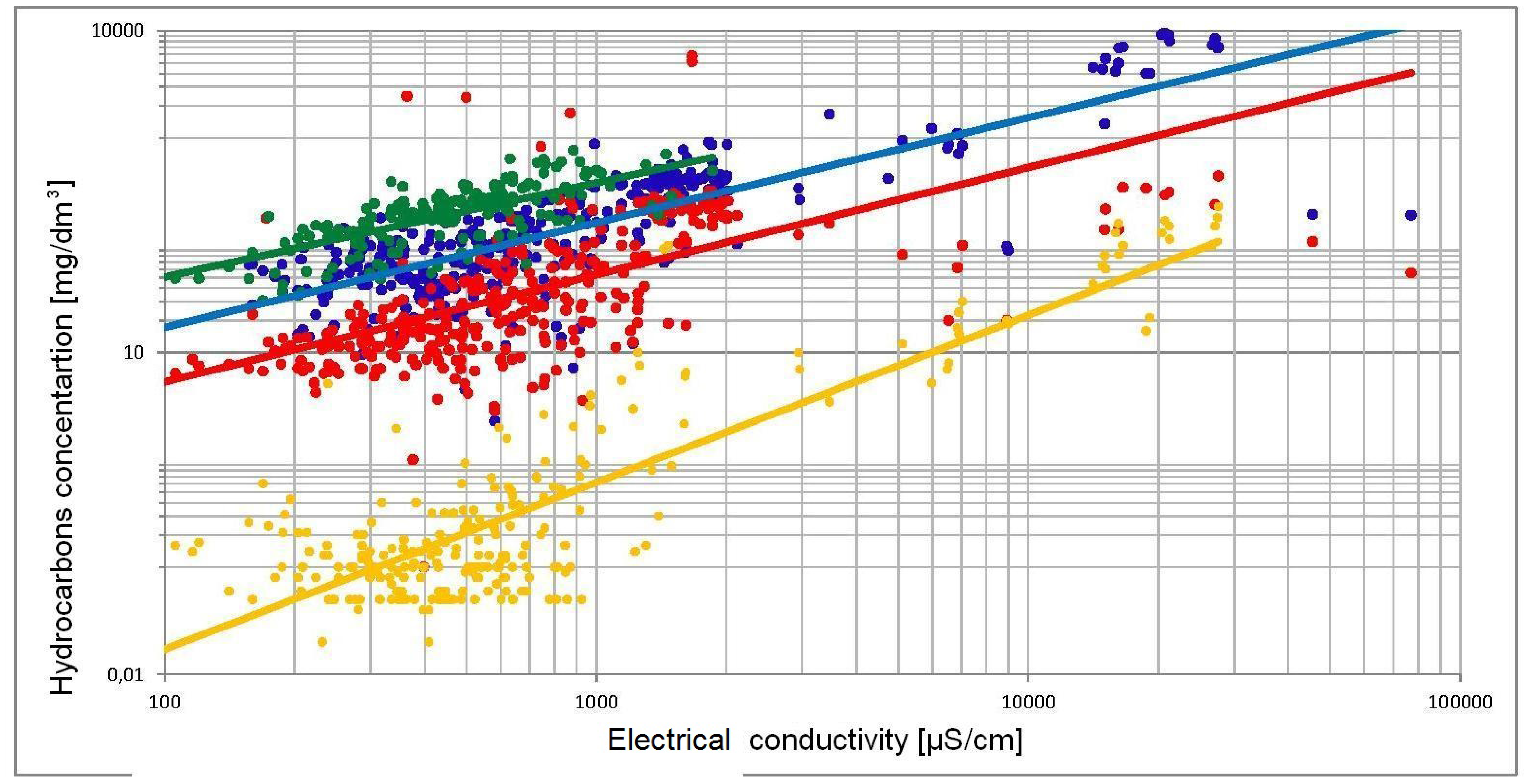 There is a direct correlation between the electrical conductivity (EC) and the amount of elements dissolved in water, and a similar correlation can be seen for the content of other elements and the water quality (chlorides, sulphates, and petroleum). Practically, even small, dissolved elemental changes in water affect the conductivity [31,32]. Thus, it can be used as a way of recording the changes in water composition, which is also influenced by contamination of the groundwater. This feature, when properly calibrated and based on analytical assessment, could be used as valuable information for a soil-water environment quality assessment [24,33].