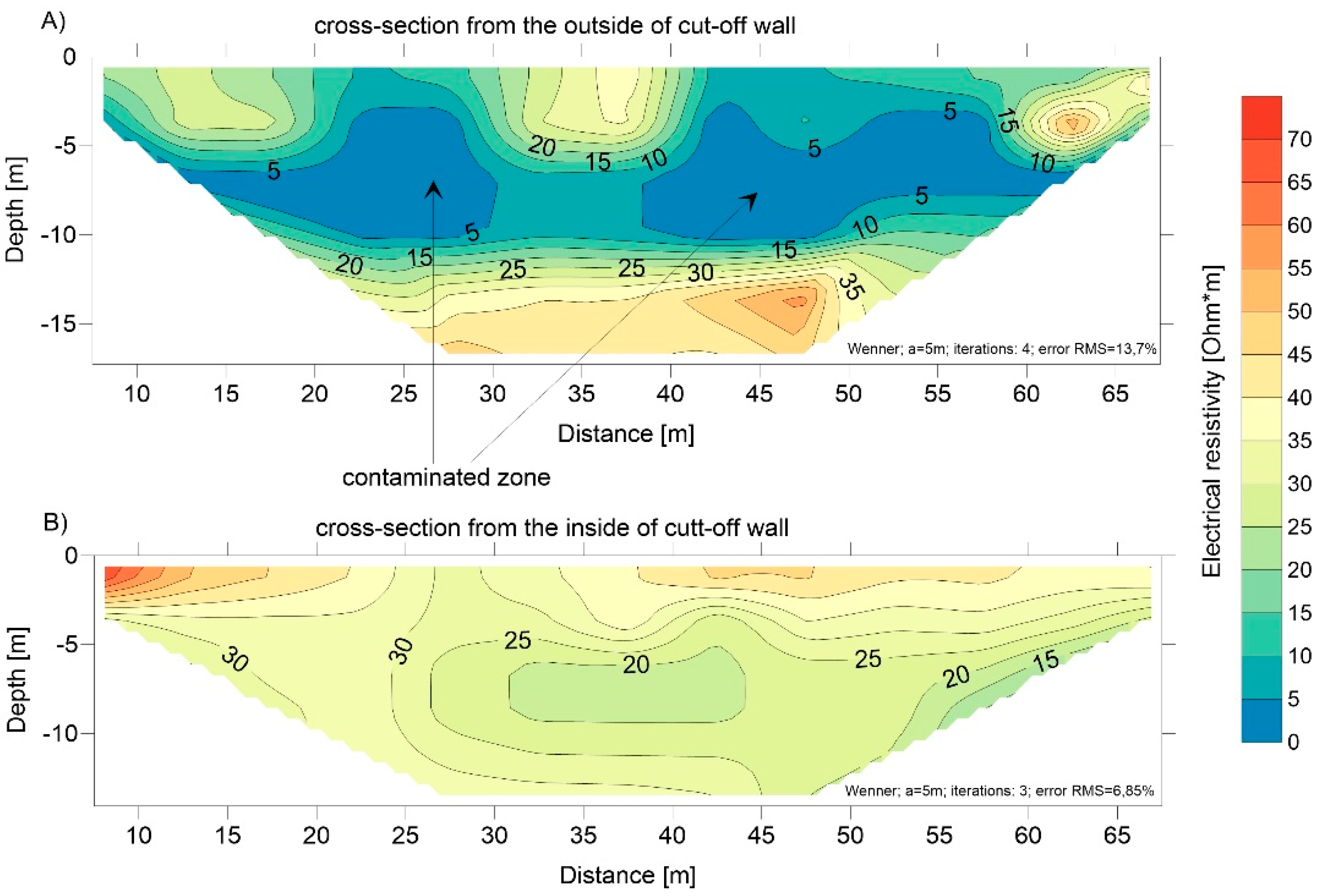 The electrical resistivity cross-section inside (A) and outside (B) the cut-off wall.