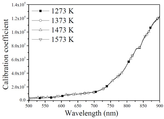 The spectra of the spontaneous emissions of flames with a certain wavelength range can be obtained by an emission spectrometer. Generally, the raw output of the spectrometer will be in photon counts of the radiation as a function of the wavelength ; these counts represent the relative spectral profile of the flame. To quantitatively analyze the spectra of the flame’s spontaneous emission, it is necessary to calibrate the profile of the spectral radiation intensities along the wavelength. As described in [14,15,17], a blackbody furnace was used to obtain the calibration coefficients . Figure 2 shows the profiles of within the wavelength range from 500 nm to 900 nm at four temperatures: 1273, 1373, 1473, and 1573 K. It can be seen that profiles of the calibration coefficients at different blackbody temperatures were consistent with each other; thus, it can be concluded that the calibration coefficients remained independent of temperature. The flame’s spectral radiation intensities can be obtained by .