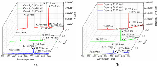 After and were obtained, the continuous spectral radiation intensities were calculated using Equation (3). Then, the intensities of the emission lines of the alkali metals were calculated by , which was used to analyze the variation of the peak intensities of the alkali metals’ lines in the MSW flame.