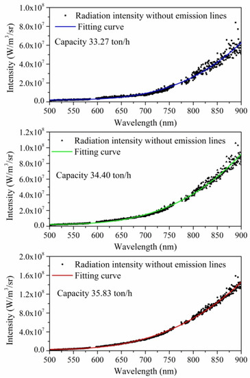Some algorithms have been proposed to automatically separate the continuous and discontinuous spectral information from the measured flame emission spectra [18]. In this paper, continuous spectral radiation intensities in a wavelength range from 500 nm to 900 nm were extracted from the measured spectral radiation intensities of the MSW flame, and they were then fitted by a fourth-order polynomial. Figure 4 shows a comparison of the original continuous spectral radiation intensities (dotted line) extracted from Figure 3b and the corresponding fitting curves (solid line). In order to evaluate the fitting performance, the goodness-of-fit coefficient (GFC) [18] quality metrics between the fitting and the original spectral radiation intensities in the absence of discontinuous emission lines were calculated as: