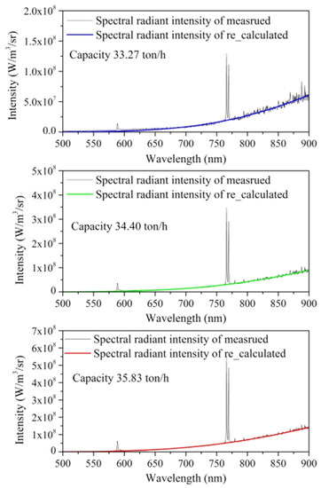 To validate the accuracy of the results, the spectral radiation intensities were re-calculated by substituting the values of the temperature and emissivity into Equation (3). Comparing the re-calculated and measured spectral radiation intensities, as shown in Figure 6, it was found that they matched well in the continuous wavelength range.