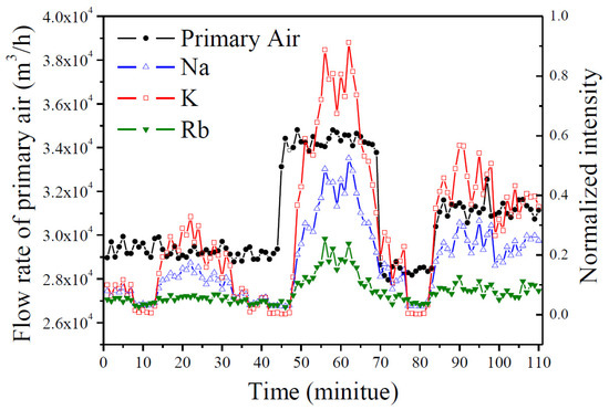 Generally, in order to decrease the pollutant emissions, the incinerator is operated with an excess air coefficient of between 1.4 and 1.6, and at a temperature higher than 850 °C. The adjustment of the primary air is crucial for controlling the excess air and the temperature in MSW incineration. A test for changing the flow rate of the primary air flow from 28,000 to 35,000 m3/h has been conducted. The measured temperature, emissivity, and peak intensities of the alkali metals’ emission lines were compared with the recorded primary air, actual evaporative capacity, and oxygen content of the incinerator, respectively. Figure 8 displays the normalized peak intensities of Na (589 nm), K (765.9 nm), and Rb (779.4 nm) emission lines, and demonstrates that the flow rates of primary air varied with time. From Figure 8, it can be seen that when the primary air was high, the peak intensities of the alkali metal emissions increased. The increased primary air enhanced the particulate entrainment in the MSW flame, so more alkali metal entered the gaseous medium of the flame instead of staying in the ash. Therefore, the concentrations of alkali metals in the flame increased, which caused the peak intensities of the alkali metals’ emission lines to increase. Changes in the peak intensities of the alkali metals’ emission lines may be related to changes in the characteristics of the MSW. However, in this experiment, the composition of the MSW used changed only slightly.