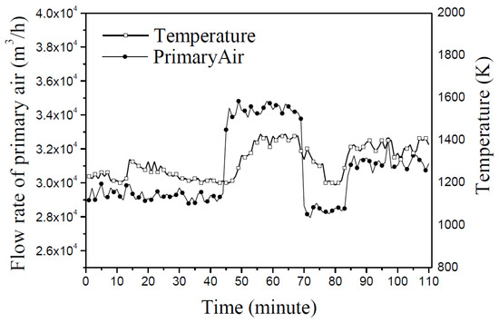 Additionally, the adjustment of the primary air affected the temperature of the MSW flame. Figure 9 displays temperatures derived from the MSW flame spectra and the primary air and shows that they varied with time. The temperature had a similar variation trend as the primary air. The increase in surface temperature on the particles leads to higher K and Na emissions; those results are similar to the release of alkali metal during biomass and coal combustion. The literature [24] shows that the release of K and Na from well-characterized biofuels was quantified as a function of temperature in a lab-scale fixed-bed reactor. Wang et al. [25] investigated the release and transformation fundamentals of sodium during pyrolysis of two Zhundong bituminous coals, with experimental results showing that the release of sodium increases with temperature, indicating that temperature has a profound effect on the volatilization of sodium. The range of temperatures was between 1200 and 1400 K. In this temperature range, the emission of pollutants, such as dioxin, can be controlled.