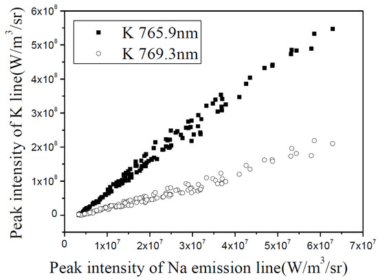 Intensities of alkali metals’ emission lines calculated from spectral radiation intensities in Figure 3b.