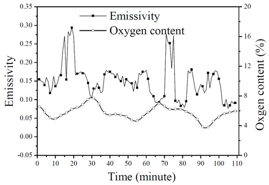 Figure 11 displays the emissivity derived from the MSW flame spectra and oxygen content in the flue gas varying with time. It is interesting that the two parameters behaved in an approximately contrary manner, which may be explained by the soot in the flame. The increased oxygen content may have suppressed soot formation. Thus, emissivity from the soot particles generated in the MSW in the furnace may increase as the flame decreases.