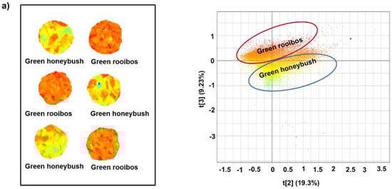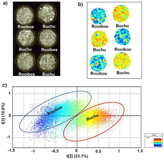 Figure 1a shows the hyperspectral RGB (red, green, blue) image of the two raw materials (rooibos and buchu) before multivariate image analysis. Visual inspection of the image does not show chemical differences between the two teas, hence the need to apply multivariate analysis tools to reveal the chemical information. Principal component analysis of the image was performed and the results obtained are displayed in the score image (Figure 1b) and the scatter plot (Figure 1c) constructed after image cleaning, mean centering and SNV correction of the data. The cumulative chemical variation modelled (R2Xcum) using three principal components (PCs) was 79.6% (R2Xcum = 0.796). The three principal components (PCs) were investigated to determine the direction in which maximum chemical variation between the two teas was most prominent. According to the three score images (t1, t2 and t3), principal component 2 (PC2) demonstrated the most variation which could be attributed to separation of the two species as demonstrated in Figure 1b. The score image of t2 showed clear chemical differences between rooibos and buchu raw materials as demonstrated by the different color score values. The buchu image showed higher score values (orange-red), while a yellow-blue color (lower score value) was observed for rooibos, confirming clear chemical differences between the two teas. In the score plot of the second and third component, it was possible to visualize two clear clusters representing buchu and rooibos raw materials along PC2 (Figure 1c). The variation modelled along principal component 2 (PC2) was 23.1% which explained the chemical variation between the two clusters while the 10.8% chemical variation observed along principal component 3 (PC3) might account for compositional differences within each tea/species. Due to the interactive nature of the score image and scatter plot, it was possible to color the pixels according to the score values as in the score image, enabling clear distinction of the buchu (PC2+) and rooibos (PC2−) clusters. Both Figure 1b,c demonstrate some degree of chemical overlap between the two species as evidenced by pixels of similar score values in both species.