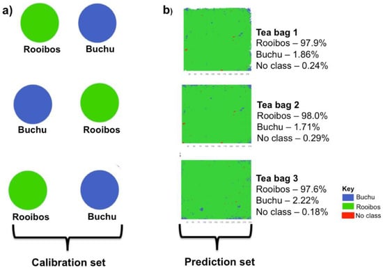 Partial least squares discriminant analysis (PLS-DA) is a supervised algorithm that aims to establish a relationship between the X data matrix and known class membership (Y). The model was constructed by assigning a class to each species in the PCA score image and each class was assigned a unique score color for differentiation. Cross-validation of the model was performed using the random exclusion method and the validation parameters were used to assess model performance. The PLS-DA model was used to predict the composition of raw material constituents in the tea bag images (external dataset). It was important to ensure that the number of pixels in the prediction image was very close to that in the calibration image so that the PLS-DA model would perform an accurate prediction of the external dataset [13,22]. Class prediction was achieved by matching the chemical information for each pixel in the tea bag to the raw materials in the calibration image. Where a match was found, the pixels in the tea bag would be assigned a color corresponding to the raw material in the PLS-DA calibration image.
