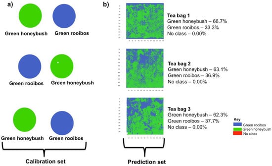 (a) Partial least squares-discriminant analysis Y-image showing classification of the raw materials in the calibration set and (b) the prediction set comprising tea bags colored according to the predicted classes.