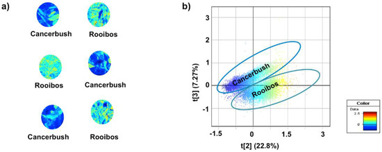 Principal component analysis of the image constituting cancer bush and rooibos raw materials was performed. The results demonstrated chemical differences between the two teas most observable along principal component 3 (PC3). The score image shows different color intensities for the two species where cancer bush had lower score values, with a dark blue color and rooibos showed slightly higher score values represented by a light blue-green color (Figure 7a). These differences were also displayed in the scatter plot where two clear pixel clusters can be observed along principal component 3 (PC3), each representing a different species (Figure 7b). When colored according to the score values, which correspond to the score image, the two clusters could be clearly assigned to cancer bush (PC3+) and rooibos (PC3−) with 7.27% chemical variation. In the principal component 2 (PC2) direction, which explained 22.80% of variation in the data, clear color gradients could be observed in the scatter plot illustrating the occurrence of various chemical compounds within each species (Figure 7b). Cumulatively, 79.5% (R2Xcum = 0.795) chemical variation was modelled using three principal components (PCs).