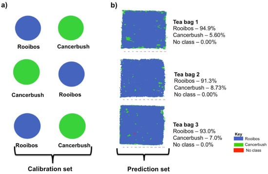 (a) Partial least squares-discriminant analysis Y-image showing classification of rooibos and cancer bush in the calibration set and (b) the tea bag blends colored according to predicted classes.