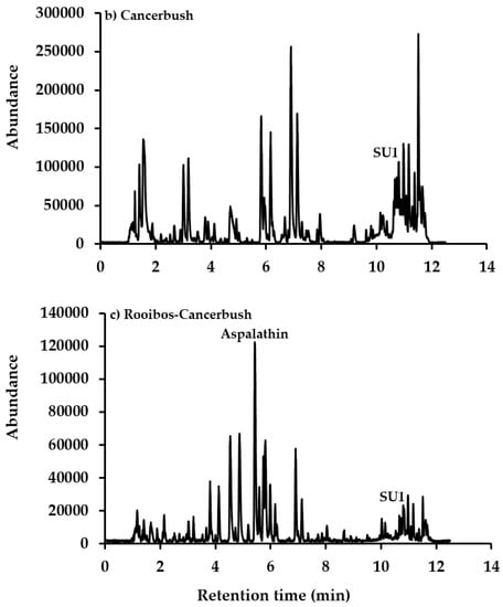 Ultra-high performance liquid chromatography mass spectroscopy (UHPLC-MS) was used to identify marker molecules of each of the species and to confirm their presence in the tea bag blends. Chromatograms representing the raw materials (rooibos and cancer bush) and the tea blend are illustrated in Figure 9. Aspalathin (Rt = 5.43 min) was identified as the major constituent in the chromatographic profiles of both rooibos (Figure 9a) and the tea bag blend (Figure 9c) when analyzed in the positive ion mode. Chromatographic profiles of cancer bush confirm the presence of SU1, which is the marker compound in cancer bush. Figure 9b shows the presence of SU1 (Rt = 10.80 min) in the raw material and the same compound was also identified in the tea bag blend (Figure 9c). These results confirm that cancer bush was included in the tea bag blend.