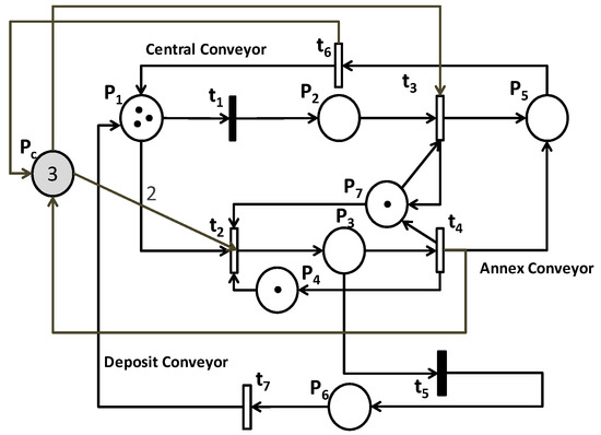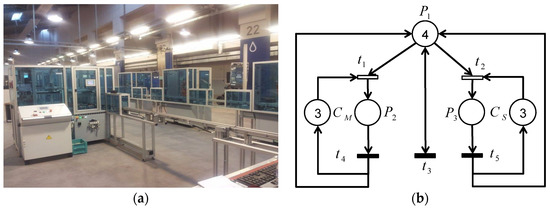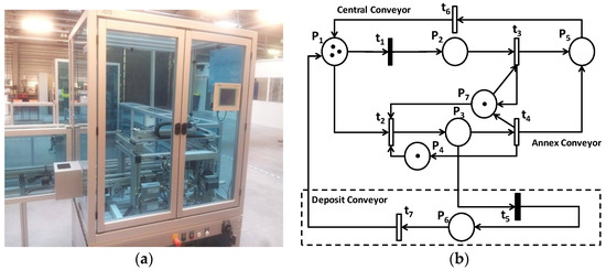 A bounded PN modeling a quality control station of the FMS is shown in Figure 8a,b. It is the final step in the production process of Lorraine University FMS. The places , and represent the central conveyor, while the annex conveyor is modeled by . Its capacity is modeled by . If the piece to manufacture is not in compliance with recommended standard, it will be placed in the waste conveyor represented by the place . Moreover, models the priority of a treated piece compared to another untested piece. Note that the transitions and are uncontrollable.