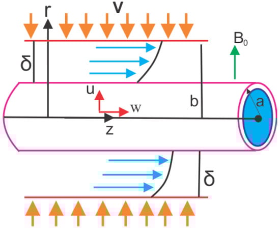- Ishak, A.; Nazar, R.; Pop, I. Magnetohydrodynamic (MHD) flow and heat transfer due to a stretching cylinder. Energ. Convers. Manag. 2008, 49, 3265–3269. [Google Scholar] [CrossRef]