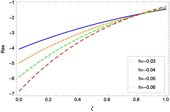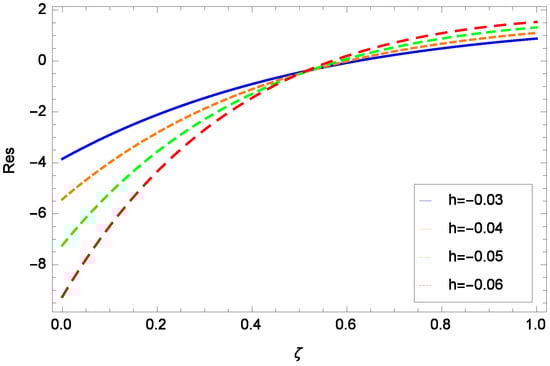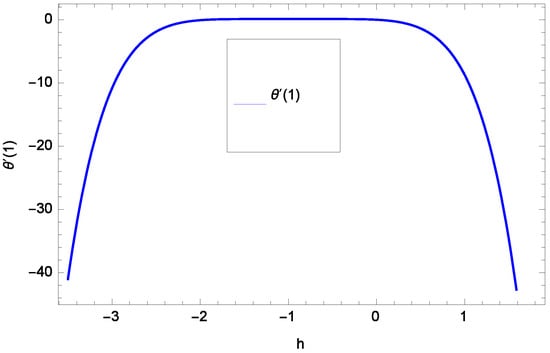 The Equations (11) and (12) with boundary conditions in Equations (13) and (14) are evaluated by the symbolic computer application MATHEMATICA using HAM program and Equation (19) is computed through HAM solution. It is interested to describe the impact of all the parameters on the non-dimensional velocity profile f(ζ), temperature distribution θ(ζ) and pressure distribution (ζ). The rate of spray m() is also discussed. The geometry of the problem is shown in Figure 1. Liao [55,56,57] introduced h curves for the convergence of the series solution to get the acceptable results of the problems. Therefore, the acceptable h-curves for f(ζ) and θ(ζ) are drawn in the ranges −2.30 ≤ h ≤ −0.50 and −2.50 ≤ h ≤ 0.50 in Figure 2 and Figure 3 respectively. The fact is known about the shear stress and rate of transfer of heat that they depend on the types of nanofluids. The type of the nanofluid has a direct relation with cooling and heating techniques. These qualities are achieved easily and quickly by choosing CuO as nanoparticles compared to AlO as nanoparticles. In this research CuO-HO is used to elaborate the impact of indispensable parameters.