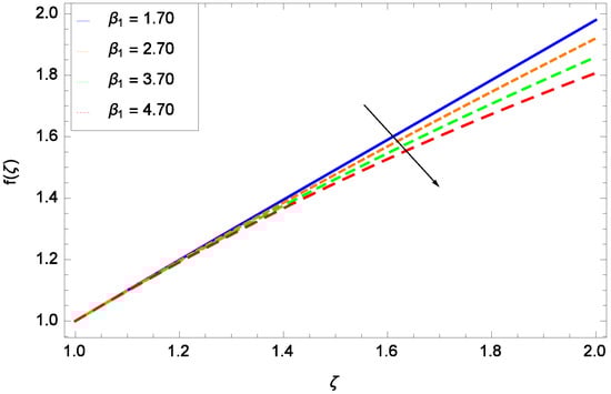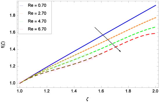 Non-dimensional velocity f(ζ) sketch for h = −1.10, = 1.70, M = 0.10, = 0.04, Pr = 6.80 and greater quantities of Re (CuO-HO).
