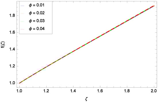 It is elucidated that motion of the fluid slows down near the stretching surface and it enhances far away from stretching cylinder. The salient characters in the film sprayed on a cylinder are the thin film nanofluid parameter and the stretching Reynolds number Re. Concentrating first the contribution of the thin film nanofluid parameter , which has the close relation to the rate of mass spray. It affects the flow behavior completely. From Figure 4, it is evident that the velocity faces retardation with greater quantities of film thickness parameter . The axial velocity f(ζ) is found to enhance with thinning of the nanoliquid film. With the increase of film thickness the mass of the fluid increases which is difficult to move. Motion automatically stops when thickness of the fluid film is high. Too much effort is required for the movement of the thick film liquid. It is very difficult to make motion in the sea compared to the flow in a pipe. The nanoparticle volume fraction parameter has a negligible effect on the motion witnessed by Figure 5. Velocity does not change with increasing values of . Figure 6 demonstrates that the axial velocity f(ζ) goes to decrease by the large values of Reynolds number Re. The reason is that the Reynolds number is the ratio of the inertia force to the viscous force so, when the Reynolds number becomes higher the inertial force overcomes the flow in contrast to viscous forces. Hence for the greater values of Reynolds number Re velocity retards and the motion decays gradually to the ambient. The inertial forces are very powerful and they do not allow the liquid atoms/molecules to flow. Strong viscous forces have strong resistance to the motion of the fluid. Boundary layer flow of fluid motion decreases with strong inertial forces. Figure 7 is prepared for the parameter M demonstrating magnetic field. As the values of M increases on surface during the flow, the motion decreases which results in to retard the motion profiles. Generally, the momentum boundary layer is made thin by greater quantities of M since the use of magnetic field to a fluid capable for conduction generates a force of resistivity called Lorentz force. This force is responsible for bringing the retardation in the movement of the fluid. This force decelerates the motion horizontally and overcomes the motion layer related to axial velocity f(ζ). This characteristic remains up to some heights and then the action is converted to slowing down. The magnetic field parameter keeps an additional influence on the motion. It is clear that magnetic field produces more restriction to the fluid. In fact, magnetic field is in contrast to the transportation.