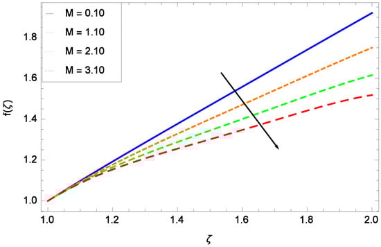 Non-dimensional velocity f(ζ) sketch for h = −1.10, = 1.70, M = 0.10, Re = 0.70, = 0.04, Pr = 6.80 and greater quantities of M (CuO-HO).