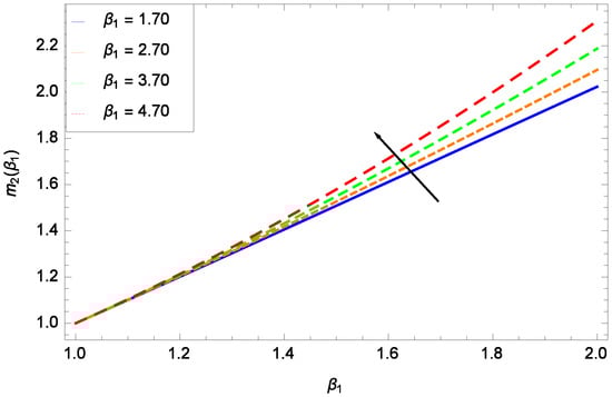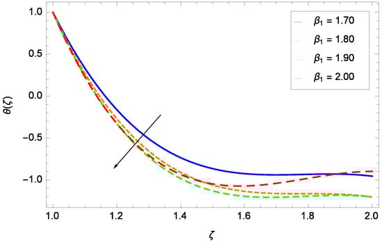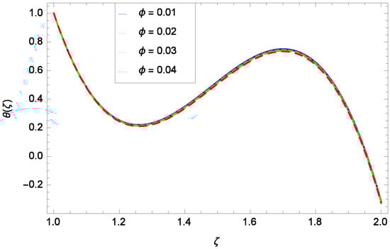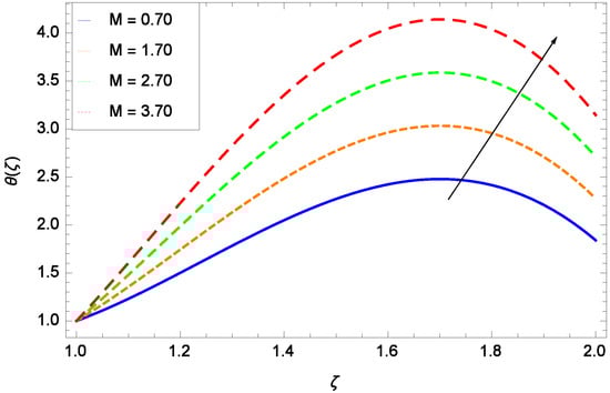 Non-dimensional temperature θ(ζ) sketch for h = −2.50, = 1.70, = 0.04, M = 0.10, Pr = 6.80 and greater quantities of M (CuO-HO).