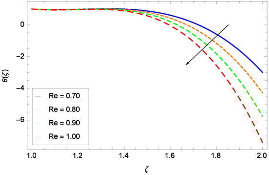 Non-dimensional temperature θ(ζ) sketch for h = −1.10, = 1.10, = 0.04, M = 0.10, Pr = 6.80 and greater quantities of Re (CuO-HO).