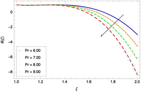 Non-dimensional temperature θ(ζ) sketch for h = −1.10, = 1.10, M = 0.10, = 0.04, Re = 0.70 and various values of Pr (CuO-HO).