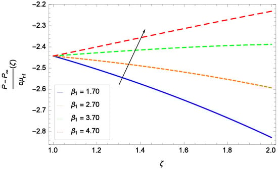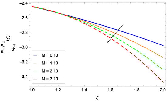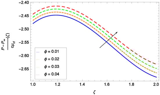 This section describes the characteristics of pressure (ζ) in terms of various parameters. Pressure has important contribution in fluid motion and blood flow. Blood circulates in the veins due to pressure. In atmosphere, pressure is inevitable to exist. There are so many machines working due to pressure. Figure 13 indicates that pressure enhances for the greater values of thin film parameter . Pressure distribution is less in magnitude in the wider part of the channel of the motion. The pressure becomes strong with the greater size of film and more power is required to overcome the stress generated due to the thickness of film. The pressure and the film thickness posses a huge force in joint collaboration. This force is very important and is used to help in moving the vehicles/objects over water, in windmills when the fluid flow and objects motion are in the same direction otherwise this force opposes the motion (in case of opposite directions) of the bodies/boats/ships. Figure 14 demonstrates that with the rise of volume fraction parameter the pressure distribution (ζ) rises because with the addition of nanoparticles the concentration increases, consequently the pressure enhances. When the concentration increases then the fluid becomes thick as a result collision of atoms/molecules increase and exert a great pressure with one another and on the walls of vessel. This characteristic of fluid is very useful for blood flow and for the concentration in medicine. Thick blood runs fast in moving down through pipe due to pressure when injected to the patient. Apart from this, almost all the chemical reactions are made at high pressure. At high pressure, cooking is done easily compared to low pressure. The pressure distribution (ζ) reduces with greater quantities of Reynolds number Re as it is depicted by Figure 15. Pressure automatically goes to minimum value in the wider way of motion due to inertial effects. Due to inertial forces the particles of the fluids are packed tightly and firmly and high pressure is required to make motion from the rest. Pressure has no effect on these attractive forces. High pressure is required to overcome these intermolecular forces. The impact of magnetic parameter M lies in Figure 16. It states that pressure distribution (ζ) is low due to the Lorentz force in the wider channel of the flow. The magnetic is applied perpendicular to the flow of fluid. Lorentz force capture the fluid in the boundary layer. To compete the Lorentz force due to strong magnetic field, pressure must be high in order to make the motion of the fluid.