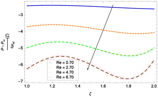 Non-dimensional Pressure (ζ) sketch for h = −1.10, = 1.70, M = 0.10, = 0.04, Pr = 6.80 and greater quantities of Re (CuO-HO).