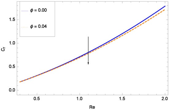Comparison of the effects of different kinds of nanoparticles on skin friction coefficient () as a function of Reynolds number Re when = 0.04.