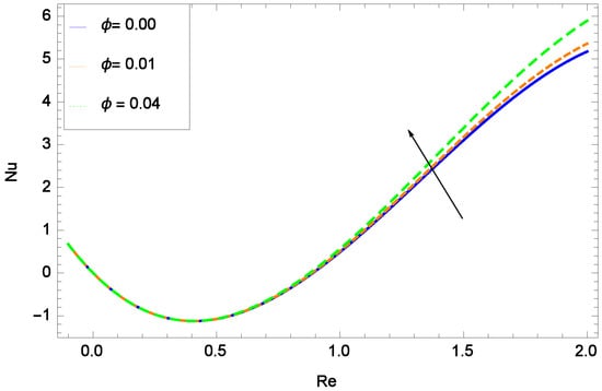 Nusselt number (Nu) when h = −0.40, = 0.10, M = 0.10, Pr = 6.80 and various values of against Reynolds number Re for (CuO-HO).