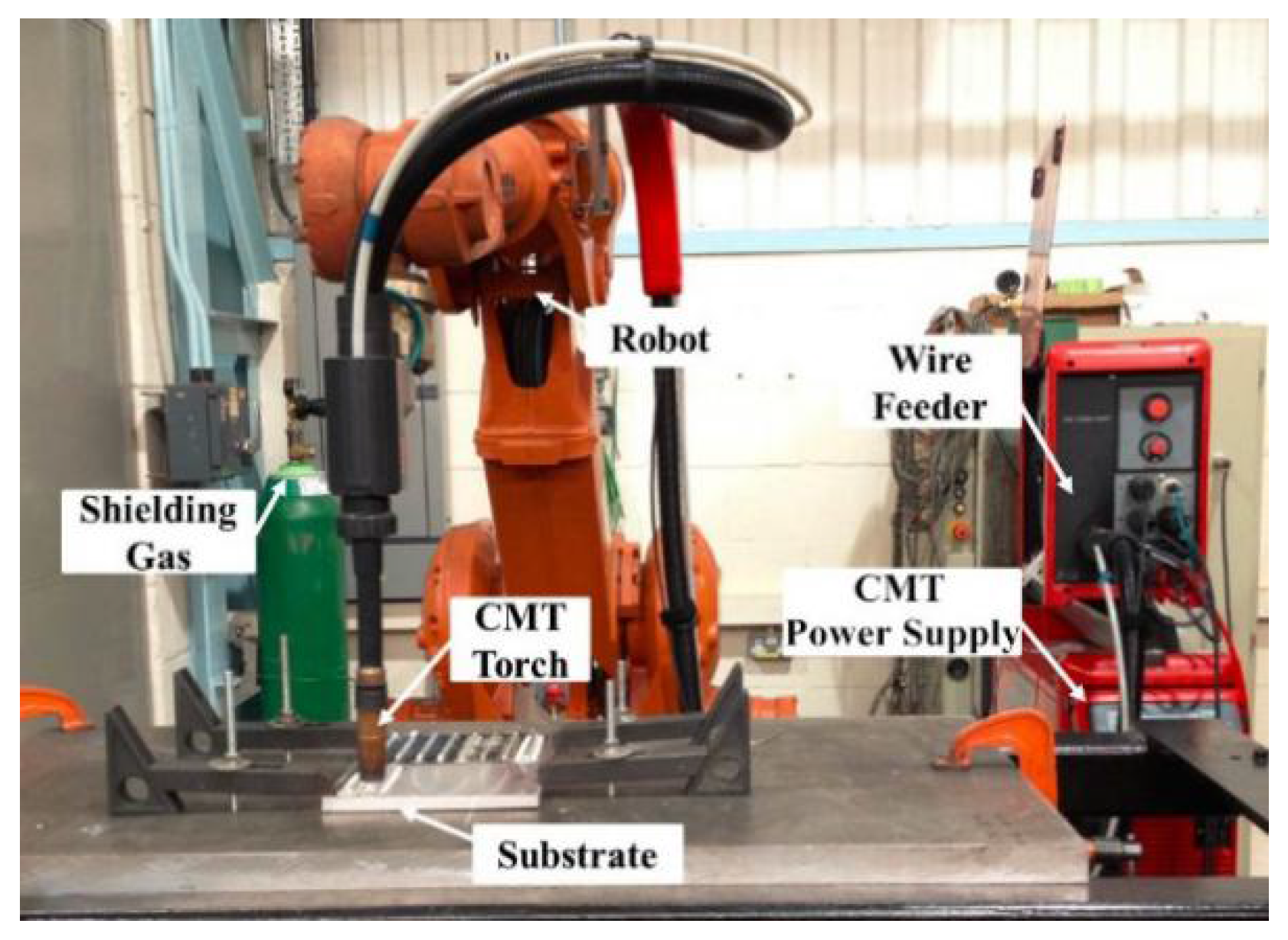 - Petro, M.S.A. Process Control and Development in Wire and Arc Additive Manufacturing. Ph.D. Thesis, School of Applied Sciences (SAS), Welding Engineering and Laser Processing Centre (WELPC), Cranfield University, Cranfield, UK, 2012. [Google Scholar]